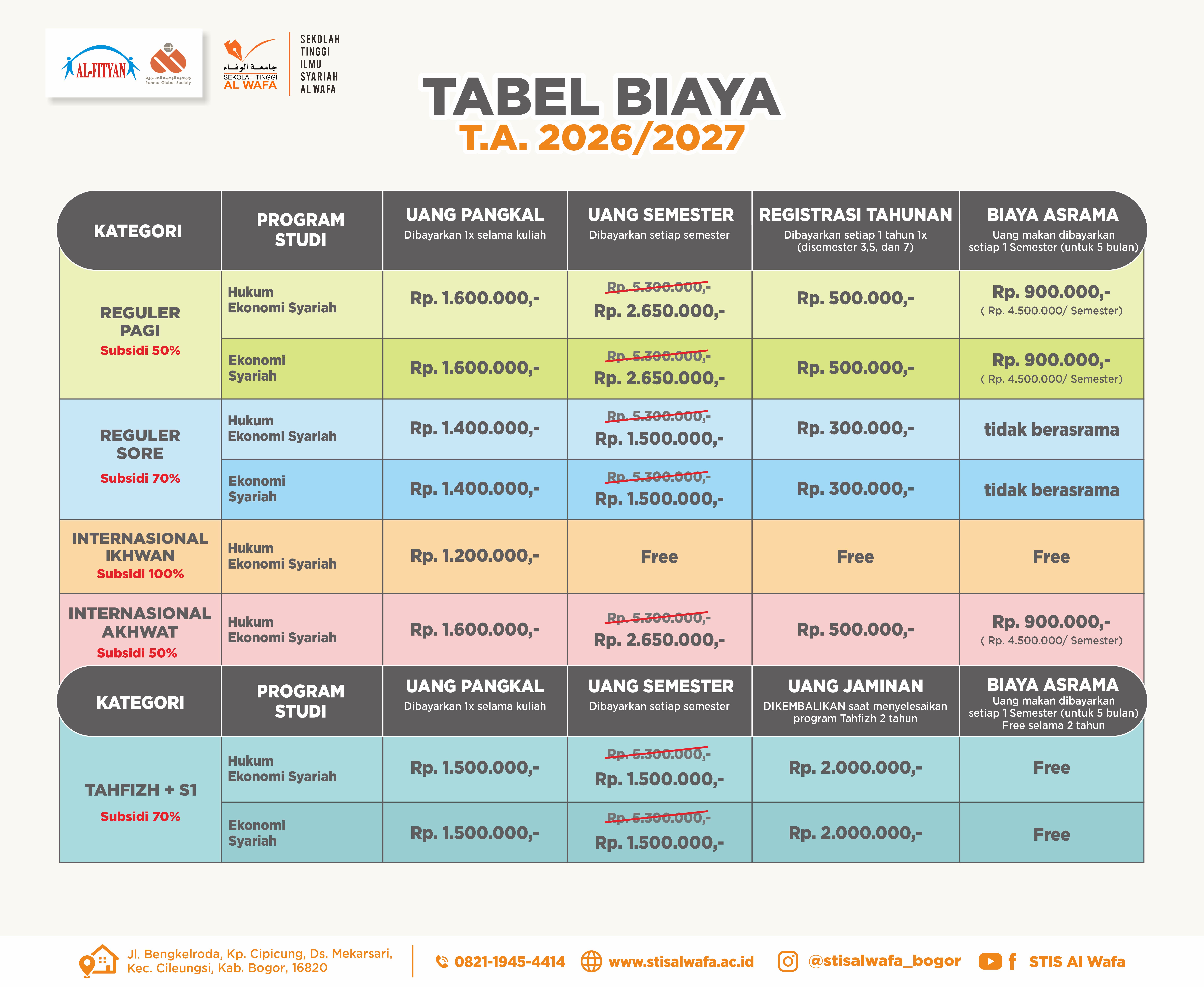 SelengkapnyaRincian Biaya KuliahBrikut adalah biaya Perkuliahan STIS Al WafaBiaya kuliah yang terdiri dari beberapa komponen dengan rincian sebagai berikutUang PangkalUang...